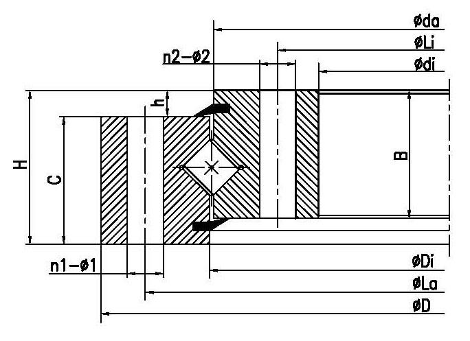 | INA 型號 | LYC 型號 | 外形尺寸(mm) | 安裝尺寸(mm) | 結構尺寸(mm) | 齒參數(mm) | 額定軸向靜負荷(KN) | 重量(KG) | | Da | D | di | H | La | Li | n1 | n2 | φ1 | φ2 | D1 | d | b | h | B | C | Di | da | m | z | do | x |