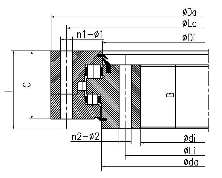 | LYC 型號 | 外形尺寸(mm) | 安裝尺寸(mm) | 結構尺寸(mm) | 齒參數(mm) | 額定軸向靜負荷(KN) | 重量(KG) | | Da | D | di | H | La | Li | n1 | n2 | φ1 | φ2 | d | b | h | B | C | Di | da | m | z | do | x | 動 | 靜 |