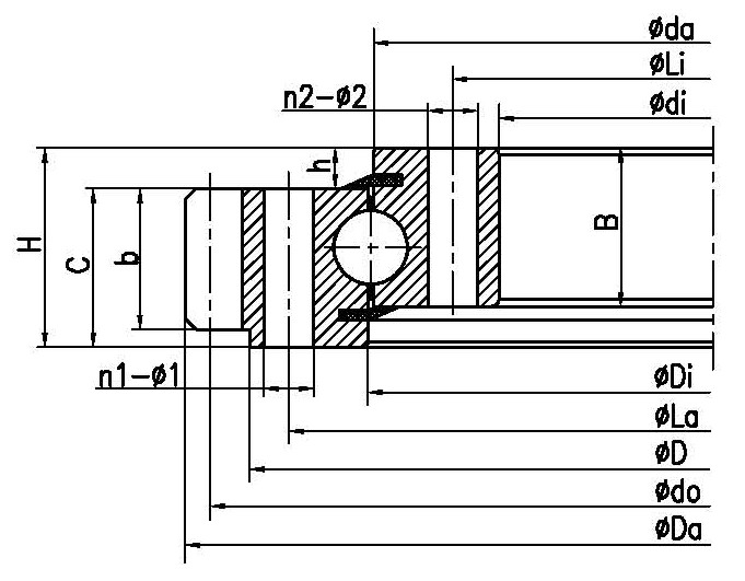 | INA 型號 | Rothe Erde 型號 | LYC 型號 | TG 型號 | 外形尺寸(mm) | 安裝尺寸(mm) | 結構尺寸(mm) | 齒參數(mm) | 額定軸向靜負荷(KN) | 重量(KG) | | Da | D | di | H | La | Li | n1 | n2 | φ1 | φ2 | D1 | d | b | h | B | C | Di | da | m | z | do | x |